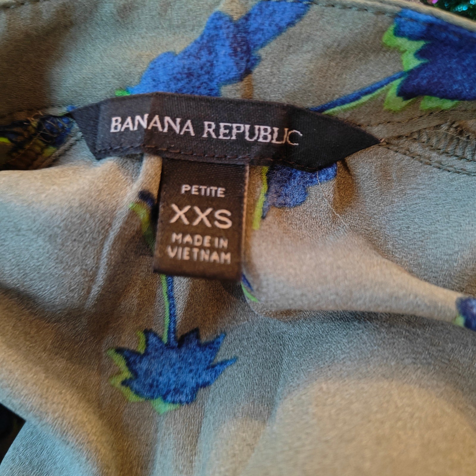 Banana Republic Petite floral dress in a soft olive green with vibrant blue flower print. This lightweight dress features long sleeves, a split neckline with button detail, side pockets, and an elastic waist for a flattering, easy fit. The relaxed silhouette makes it perfect for work, brunch, or transitional seasons layered with boots or flats.