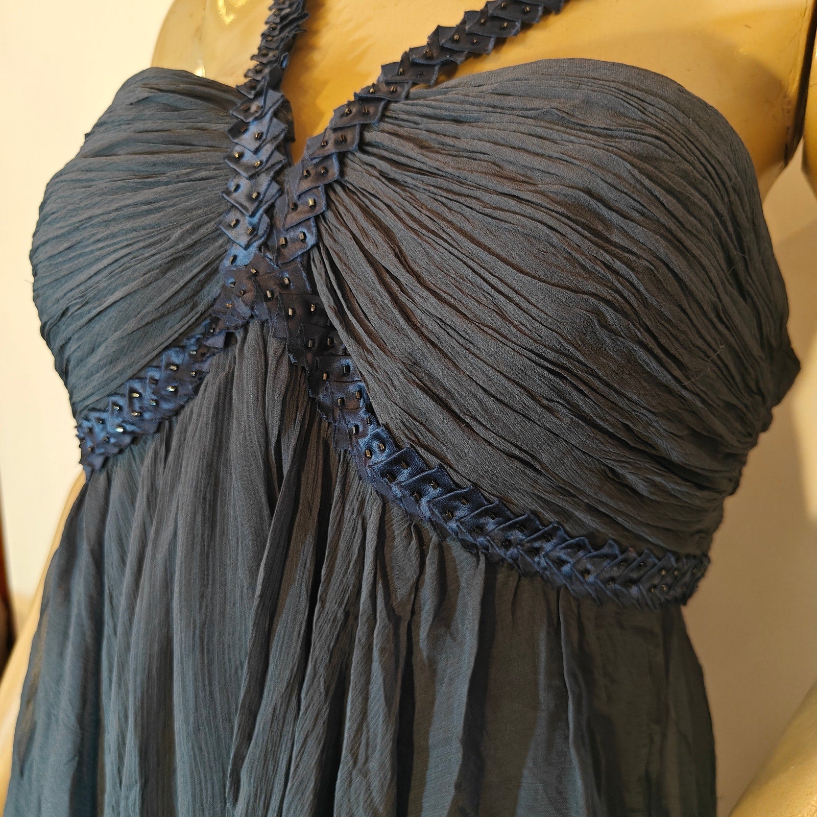 Elegant and feminine BCBGMAXAZRIA midi dress in a soft slate/blue tone. Crafted from lightweight silk chiffon with a flowy, pleated skirt and flattering empire waist silhouette. Features a ruched bodice, delicate trim detailing, adjustable shoulder straps, and a concealed back zipper closure. Fully lined for comfort and coverage.