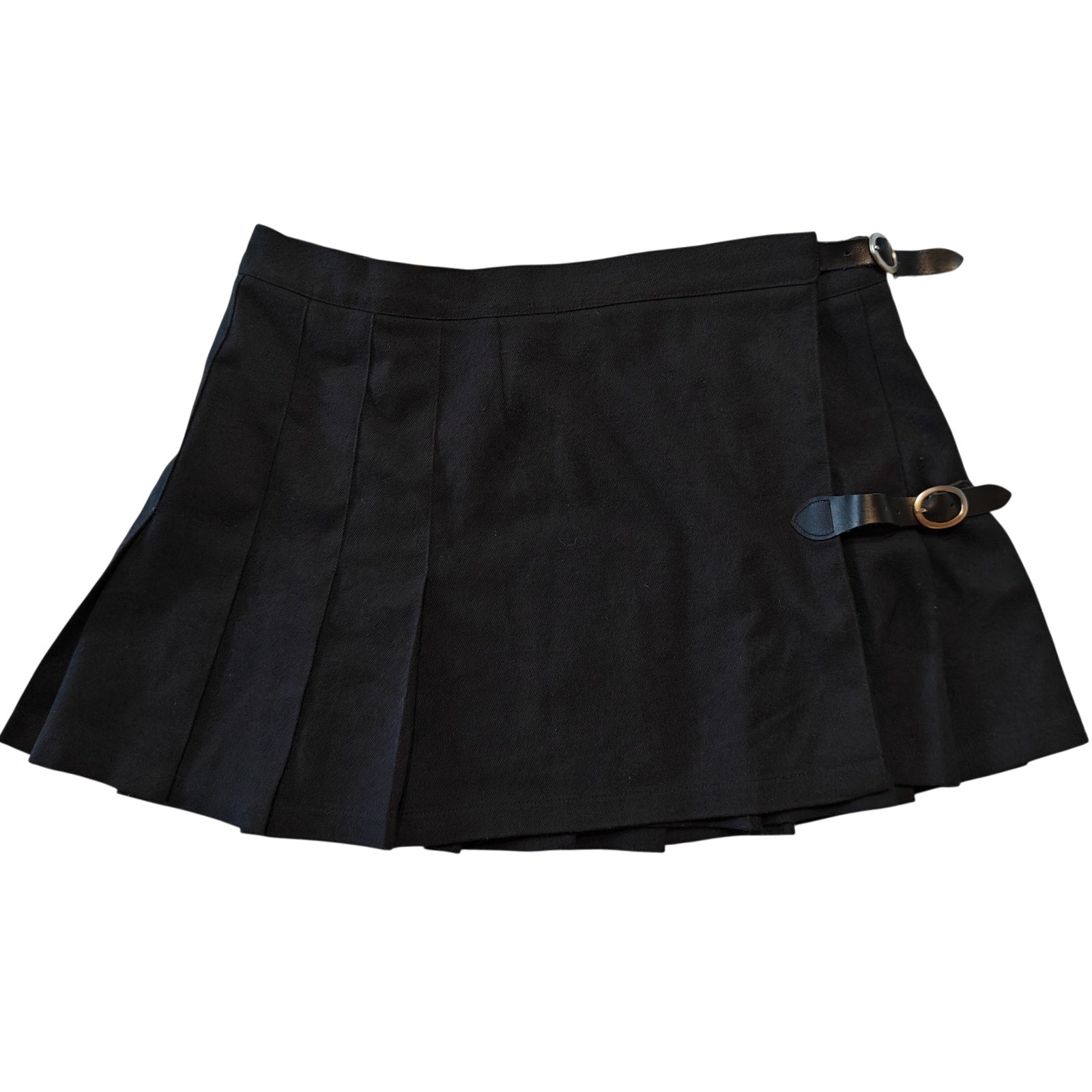 Brandy Melville black pleated mini skirt with edgy side buckle details. Features a structured waistband, classic pleated silhouette, and adjustable strap accents with silver-tone hardware on the sides for a subtle statement look.