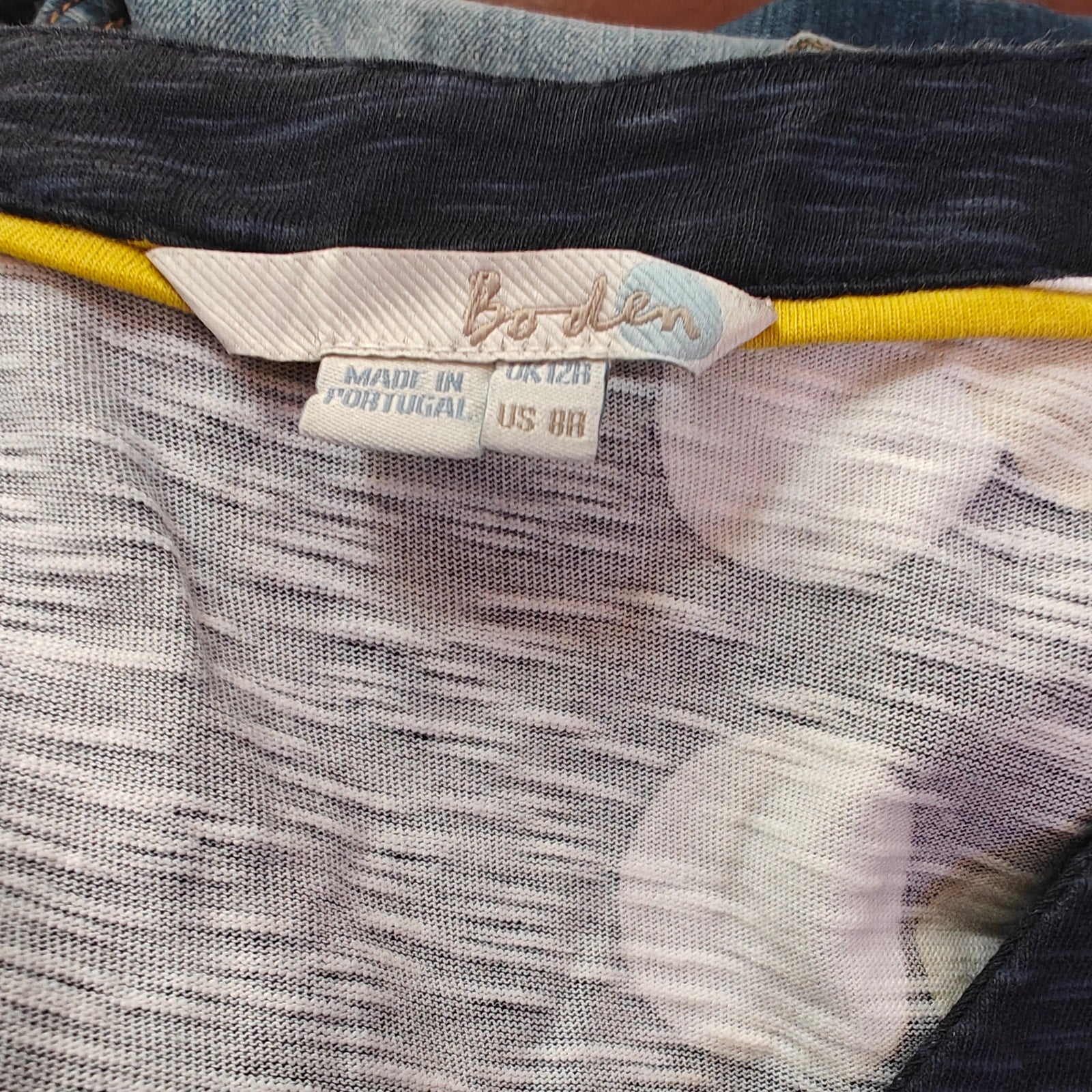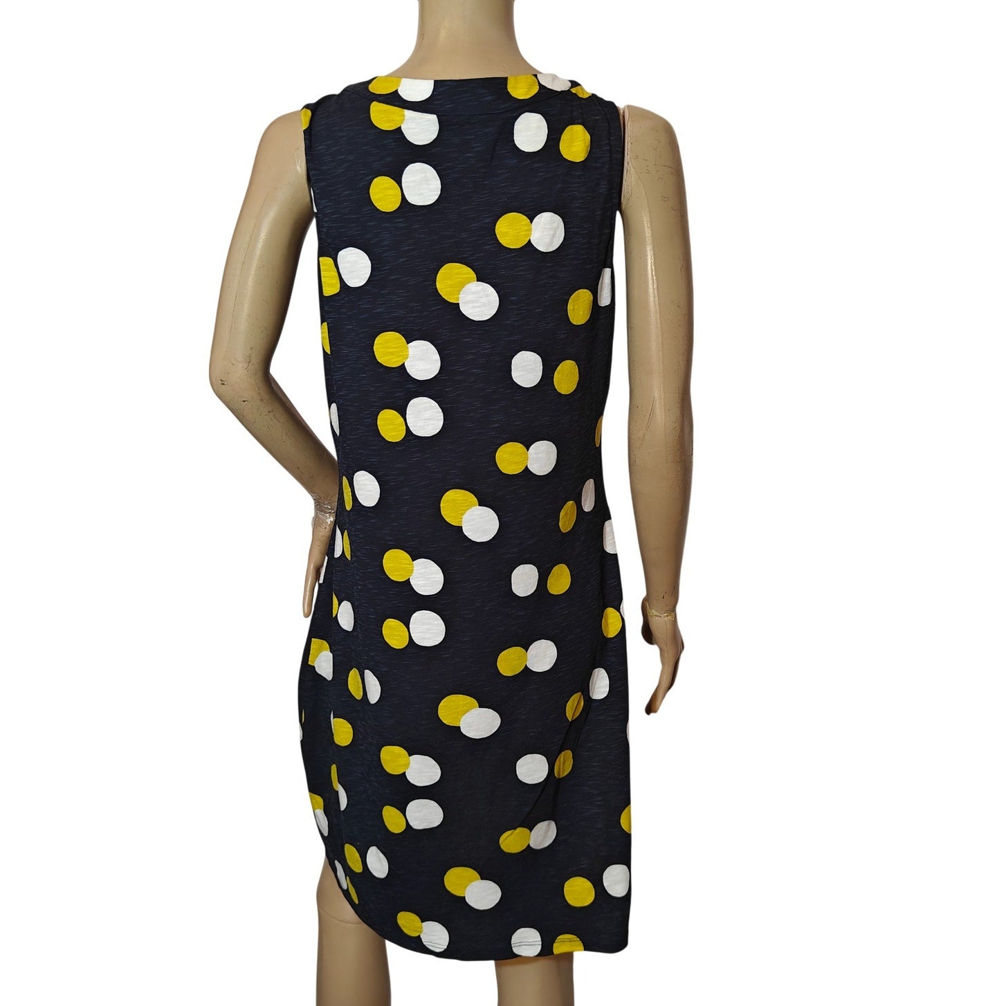 This charming Boden sleeveless shift dress features a playful navy, yellow, and white polka dot print with a flattering V-neckline adorned with contrast trim. Made from soft, breathable fabric, it offers an easy, comfortable fit perfect for warm-weather outings, casual days, or vacation wear.