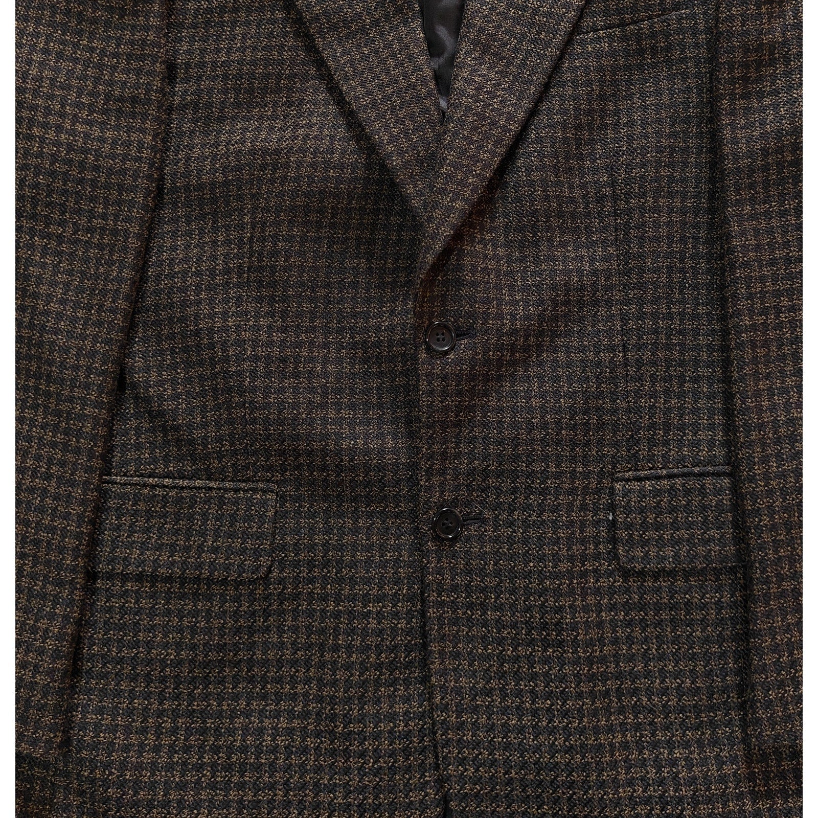 Features a rich brown and black micro-check pattern with structured shoulders and traditional notch lapels. Fully lined interior with two-button front closure and flap pockets for a timeless, versatile look.