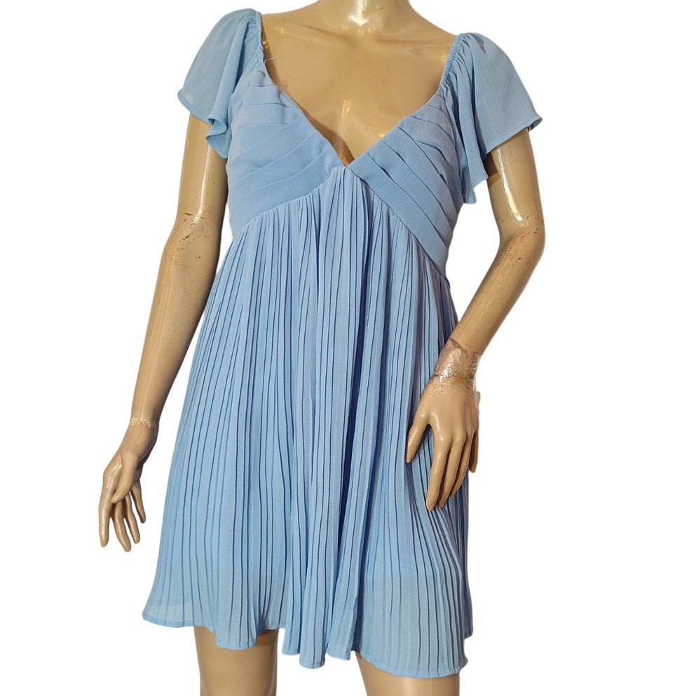 Style: Pleated A-line mini dress with flutter sleeves & open back tie