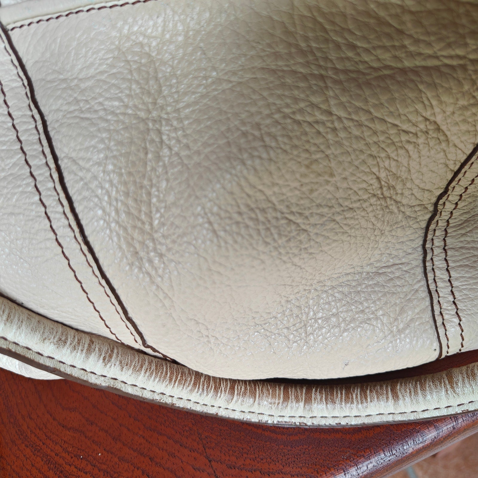 Features pebbled texture, brass hardware, double handles, and striped logo lining with multiple interior pockets. Roomy, structured design perfect for everyday or work wear. Gently used, some pen marks and scuffs. Handles show wear.