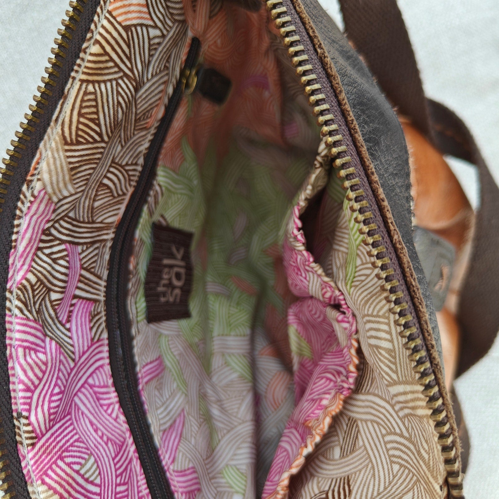 Chic and easy crossbody from Sakroots (by The Sak). Soft brown genuine leather with darker trim, antiqued brass hardware and an adjustable web strap. Zip-top main compartment with a bright printed lining, interior zip/slide pockets, and an exterior front pocket with buckle detail. Lightweight, boho-meets-utility style that’s perfect for hands-free errands or travel.