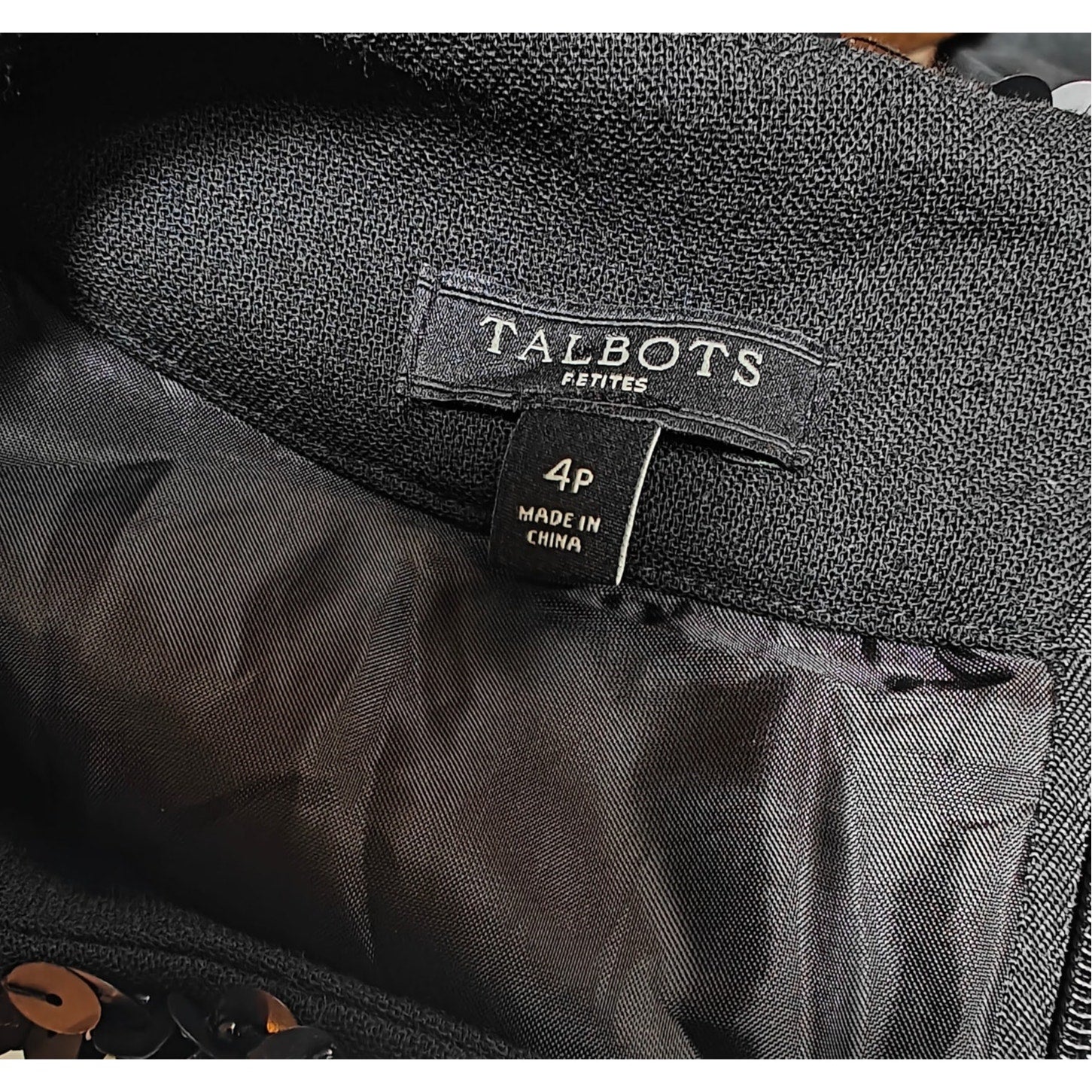 Classic and polished Talbots sheath dress in petite size 4P. Rich black fabric with a beautifully beaded/sequin–embellished neckline, sleeveless cut, tailored waist, and a flattering knee-length silhouette. Fully lined with a hidden back zip for a smooth fit—perfect for work events, holiday parties, weddings, or any dressy occasion.