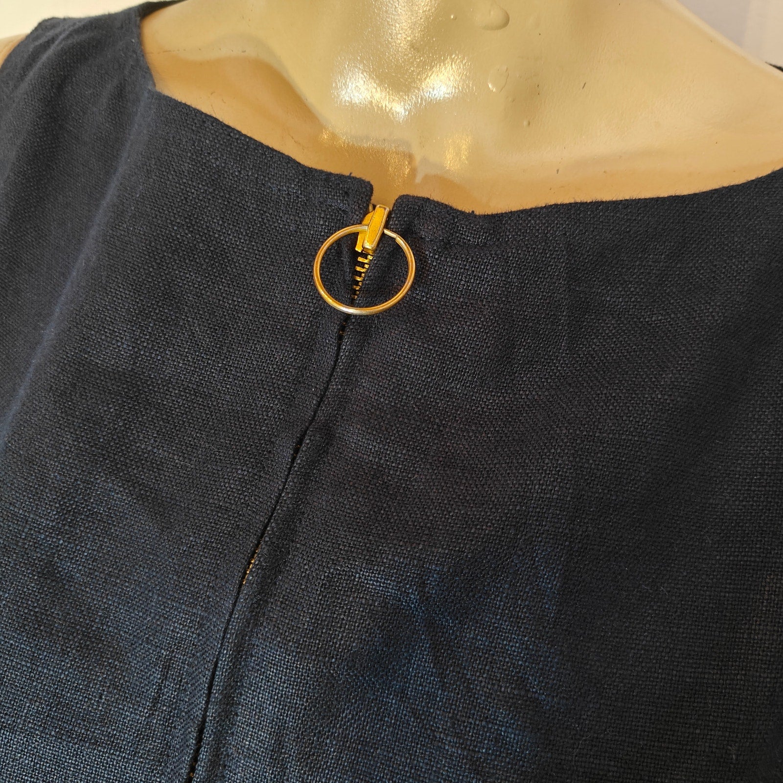Classic and timeless Tory Burch sleeveless shift dress in a deep navy linen. Features a flattering straight silhouette, functional front pockets, and a chic gold ring zipper at the neckline. Fully lined for structure and comfort. Perfect for warm weather, workwear, vacations, or polished everyday style.